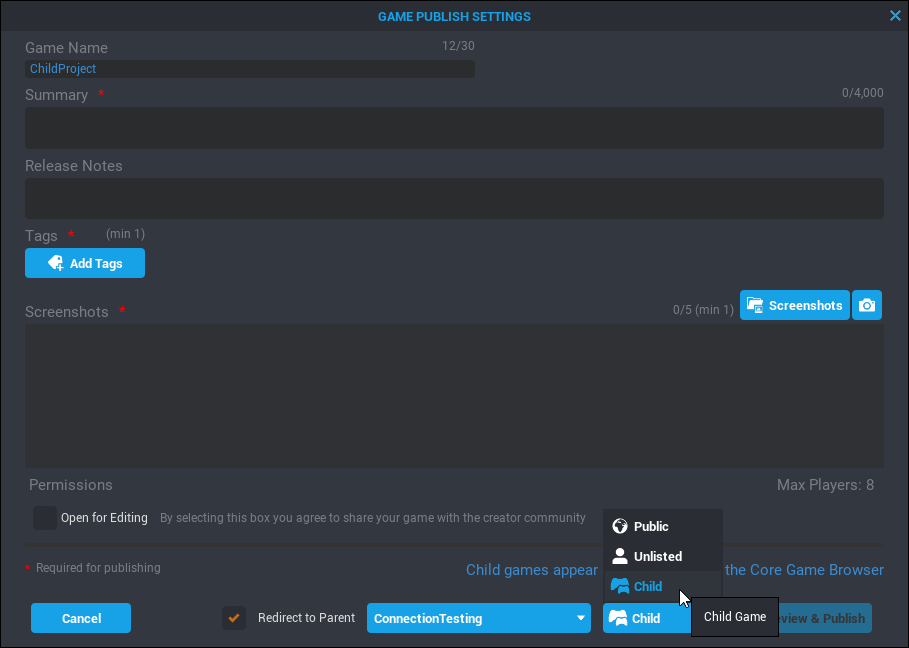 Once you have a public game to use as a parent, any other game you publish can be marked as a child of that game.