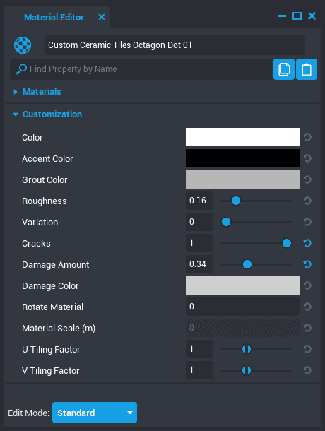 Some materials have properties specific to them. For example, the ceramic materials have Damage Amount and Cracks, allowing for a more distressed look. Hover over any property name to read what it does.