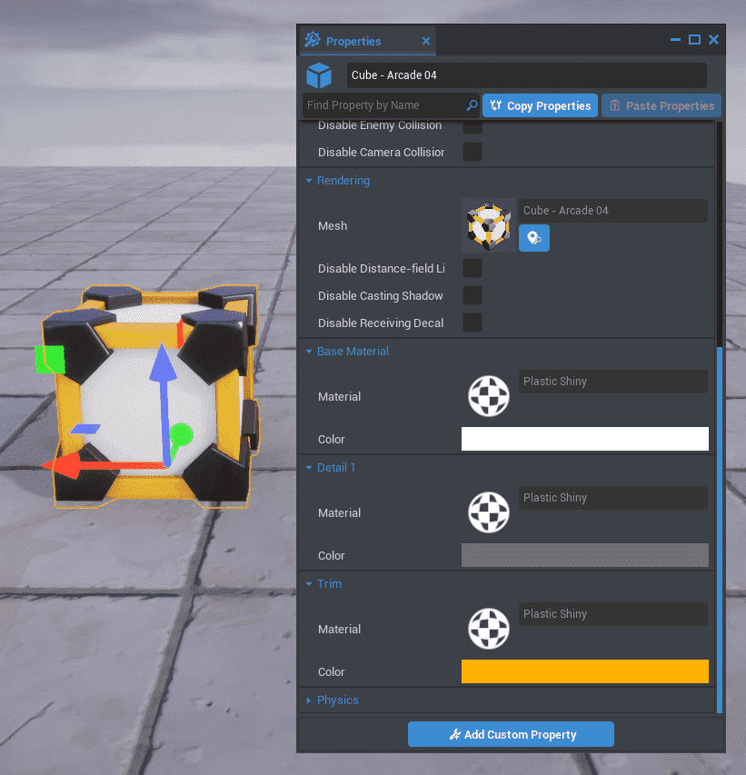 Some objects have multiple material slots, such as the Cube - Arcade 04 object, allowing you to further customize the look of your game.