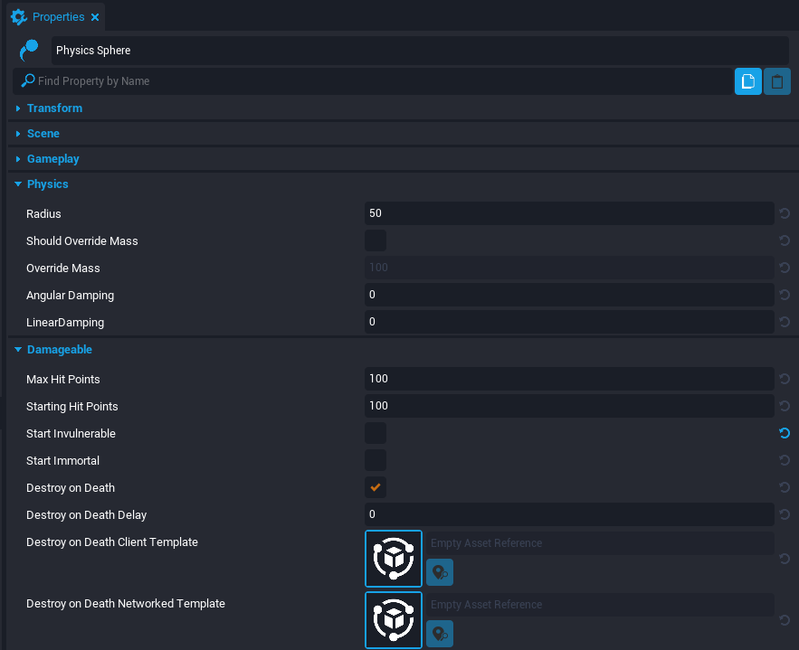 Physics Objects have two important sections in the Properties window: Physics and Damageable.