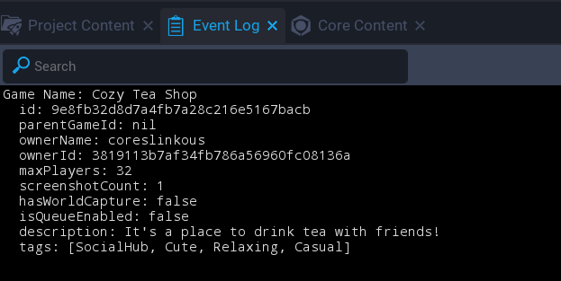 In the example below, all the information received by GetGameInfo is printed out to the Event Log.