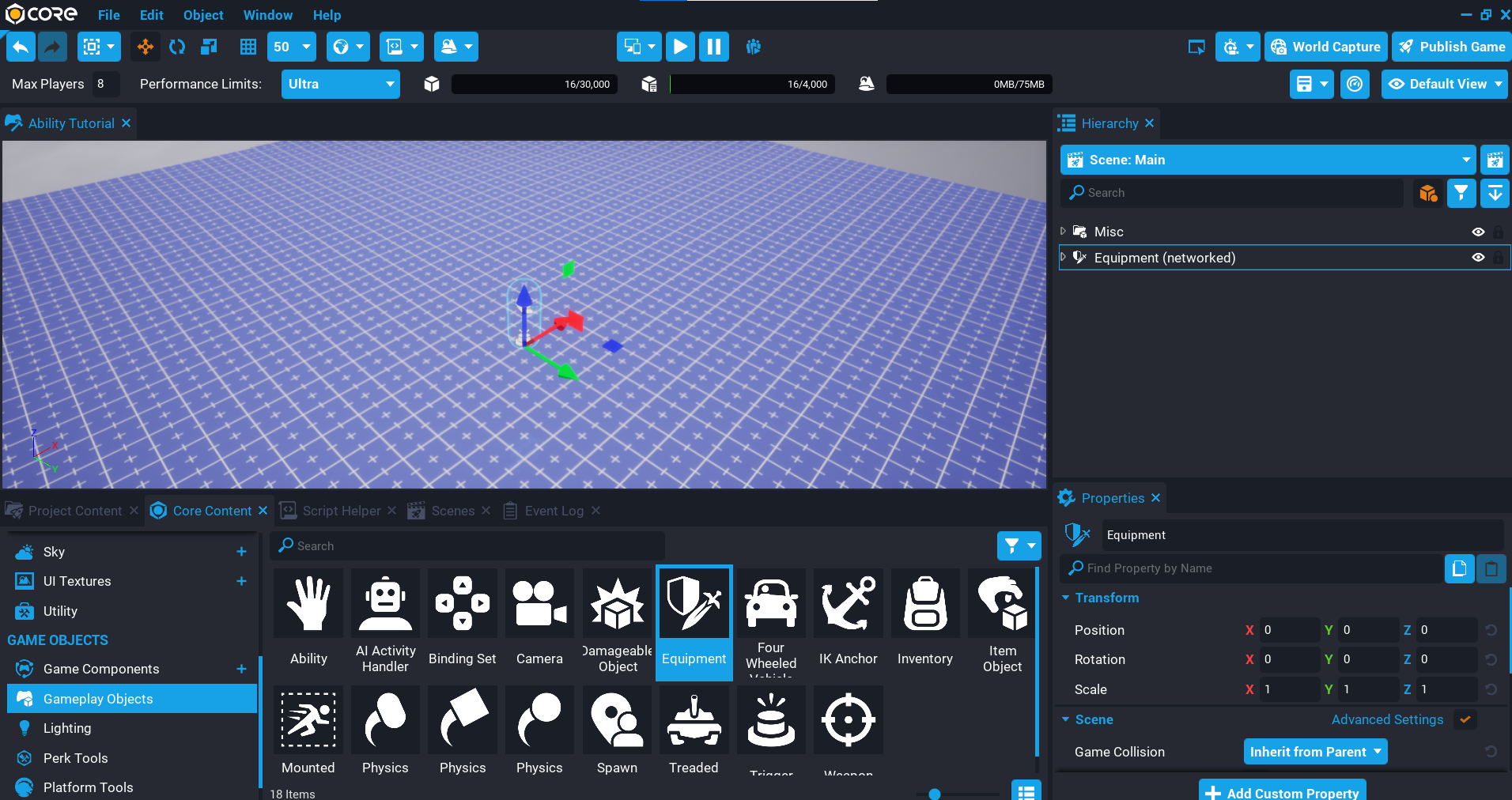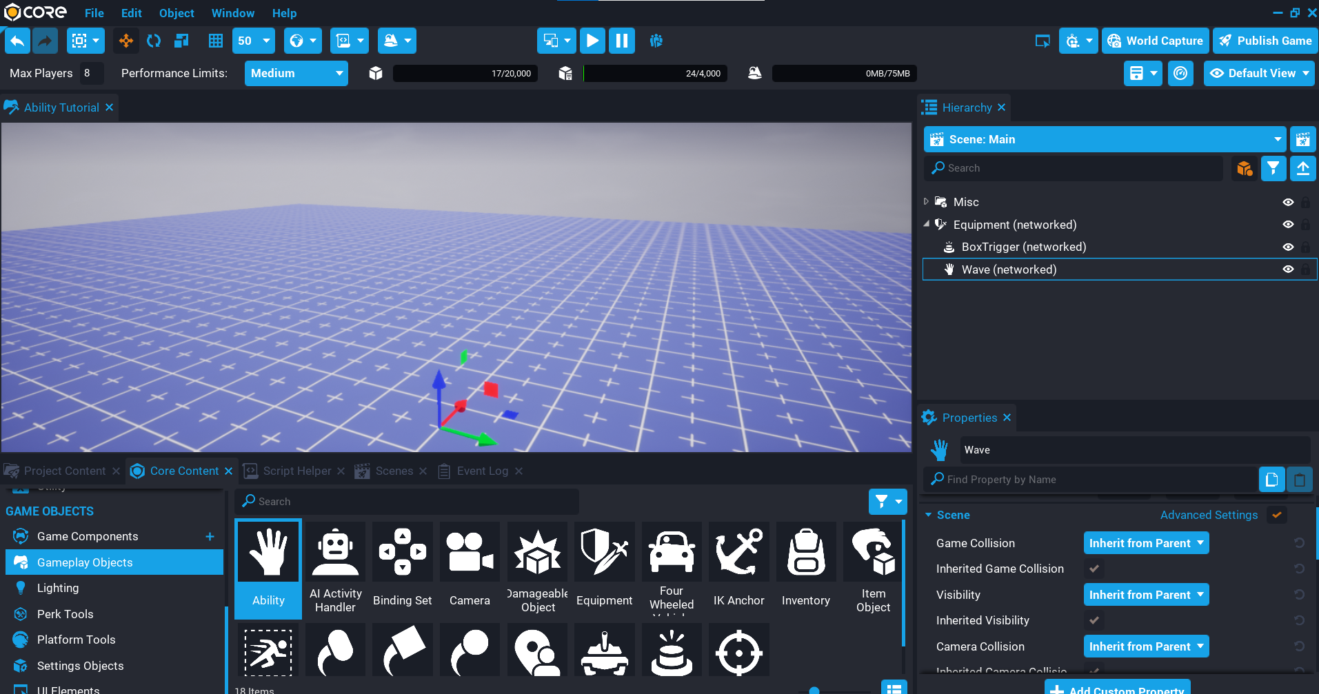 In this tutorial you will create an ability that can be picked up in the world, and when activated, the player will wave. You will be using Core Content components that can be placed in the Hierarchy, so no Lua knowledge is needed.