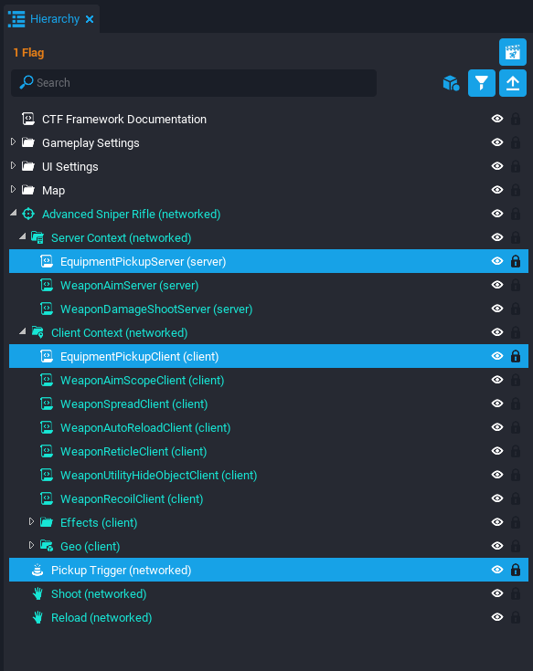 The Advanced Sniper Rifle template has children scripts and a trigger box for picking up the weapon from the ground. Since the player will spawn with the weapon in their hands, there will be no need for this functionality.