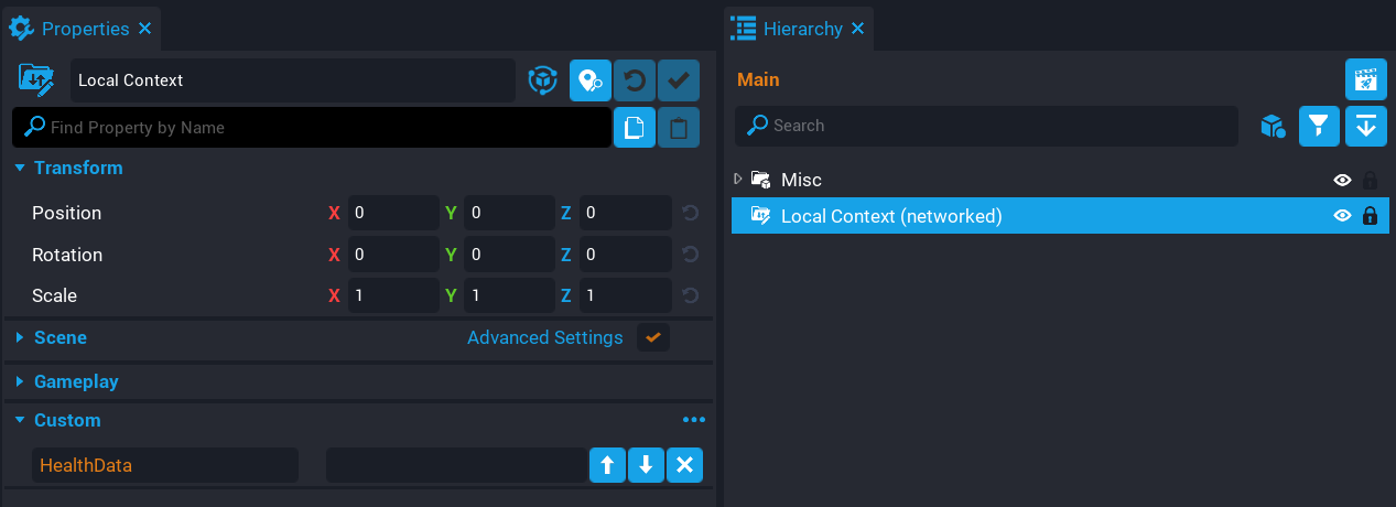 The Local Context will contain all the objects that would normally be networked. These objects (including scripts), will be spawned on the server and the client. The local context you will create will need to have networking enabled. The reason for this is that the custom networking method you will be using in this case is Dynamic Properties**. All health data for the damageable objects will be sent to the clients this way.