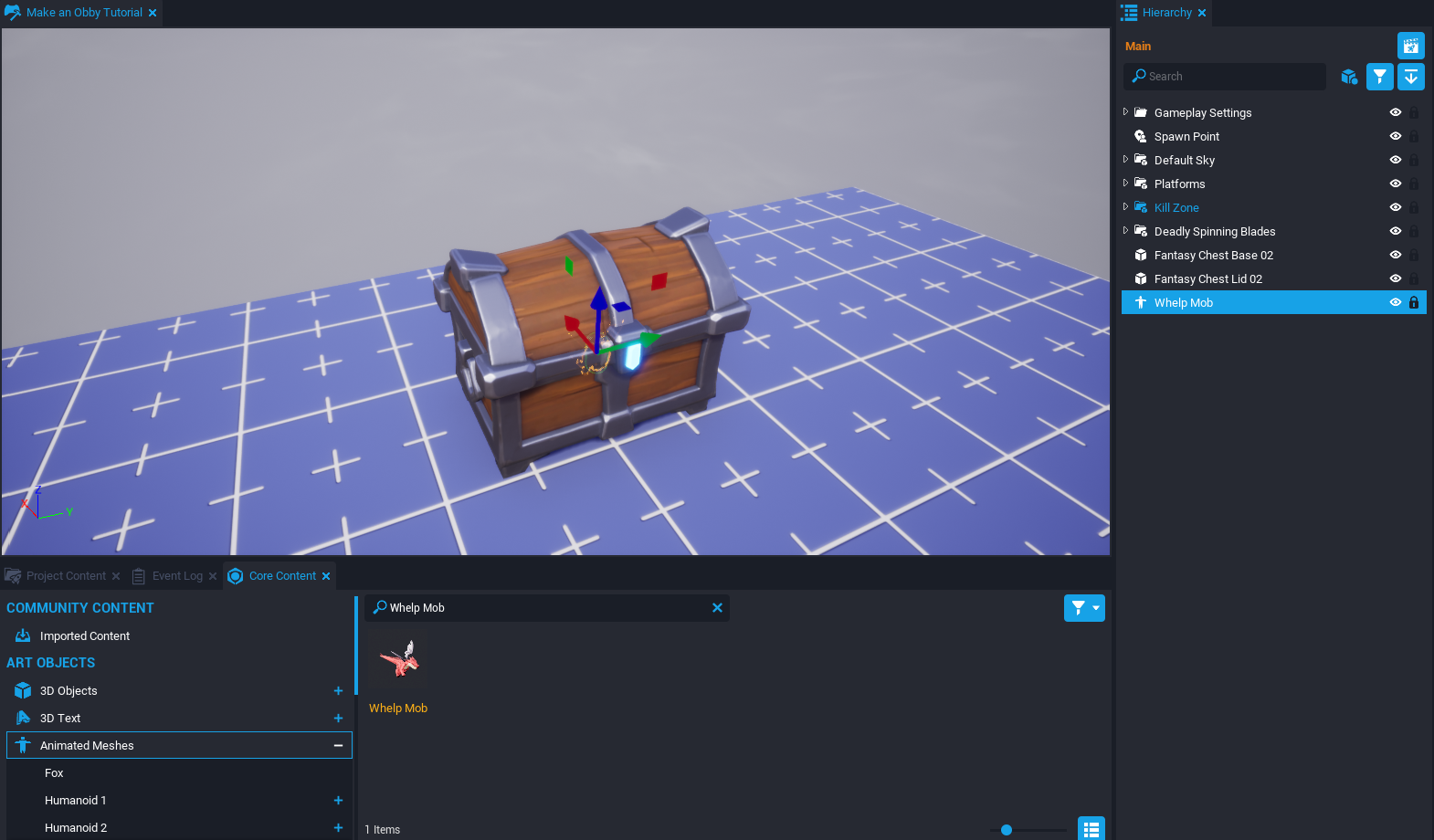 In this tutorial, you are going to make an Obby, which is a platform and obstacle game. The game will have moving, rotating, and shrinking platforms as well as deadly spinning blades. The game will also have a rewards chest that can animate open and close. The reward inside is a flying pet that follows the player.