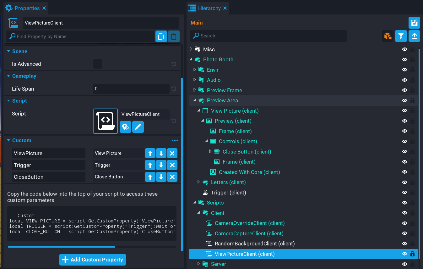 Create a script called ViewPictureClient and place it into the Client folder in the Hierarchy. This script will be responsible for showing the UI to the player when they interact with the trigger to view their picture.
