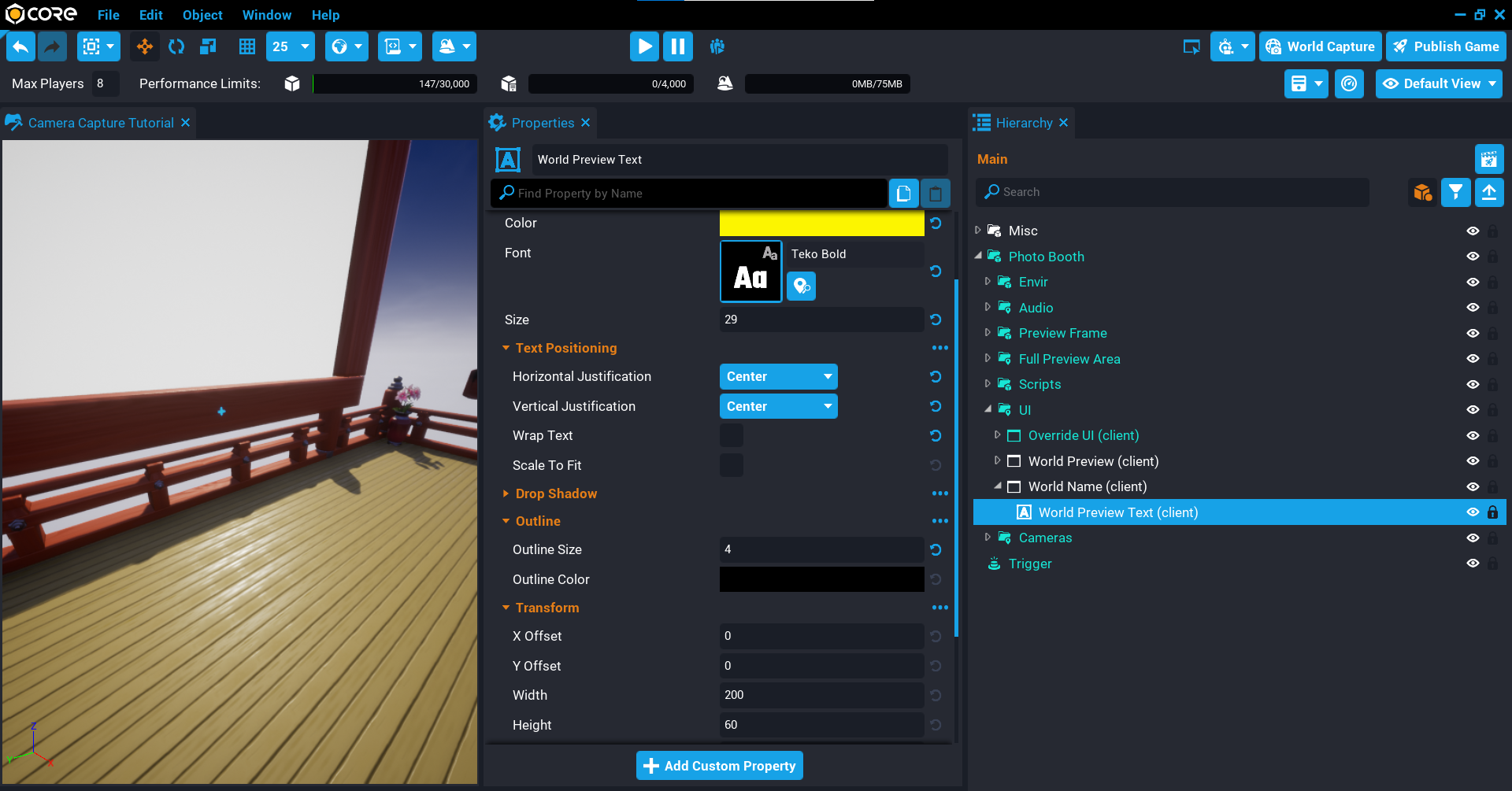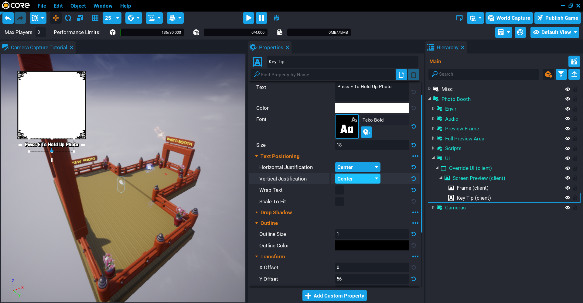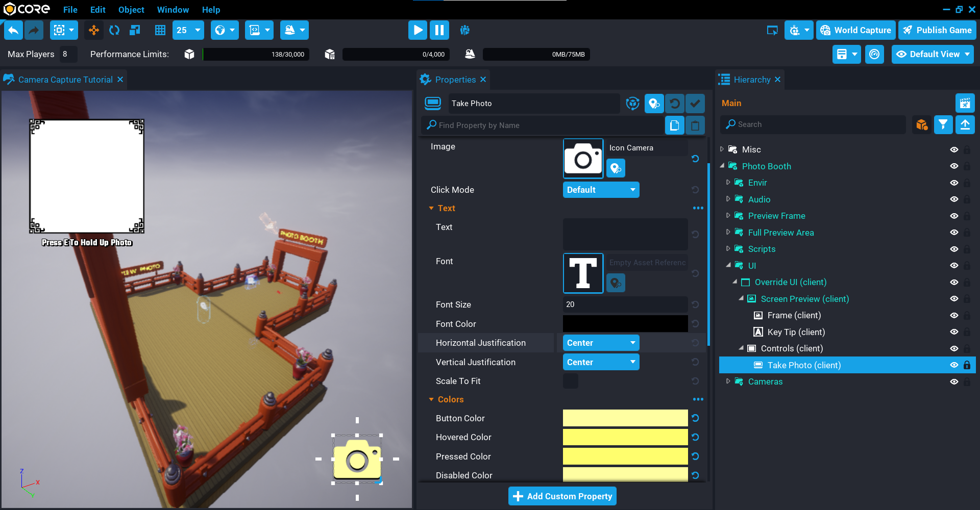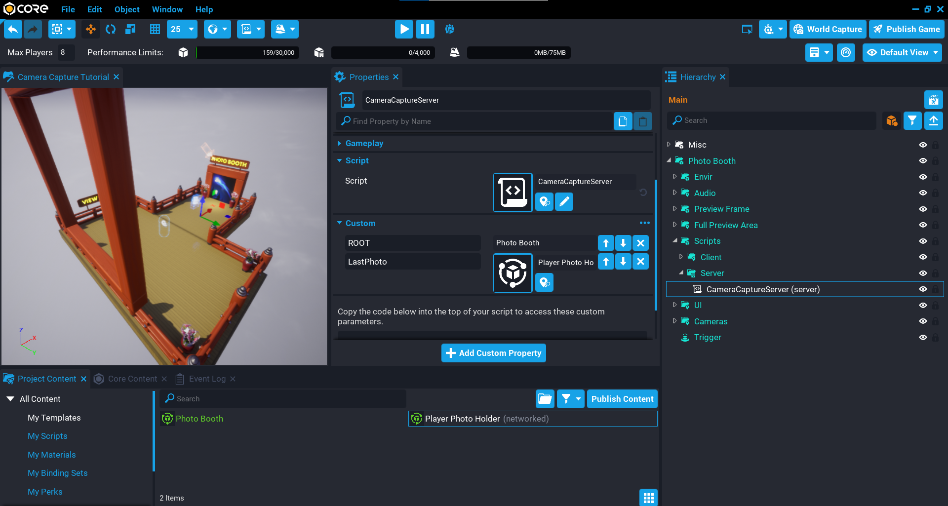 In this tutorial you will be creating a Photo Booth where players can stand in front of a Camera to take pictures of themselves and other players in the shot. These Camera Captures will be shared with the rest of the players in the game so they can see your picture. You will be using your camera capture knowledge from previous tutorials to create a multiplayer experience for your players.