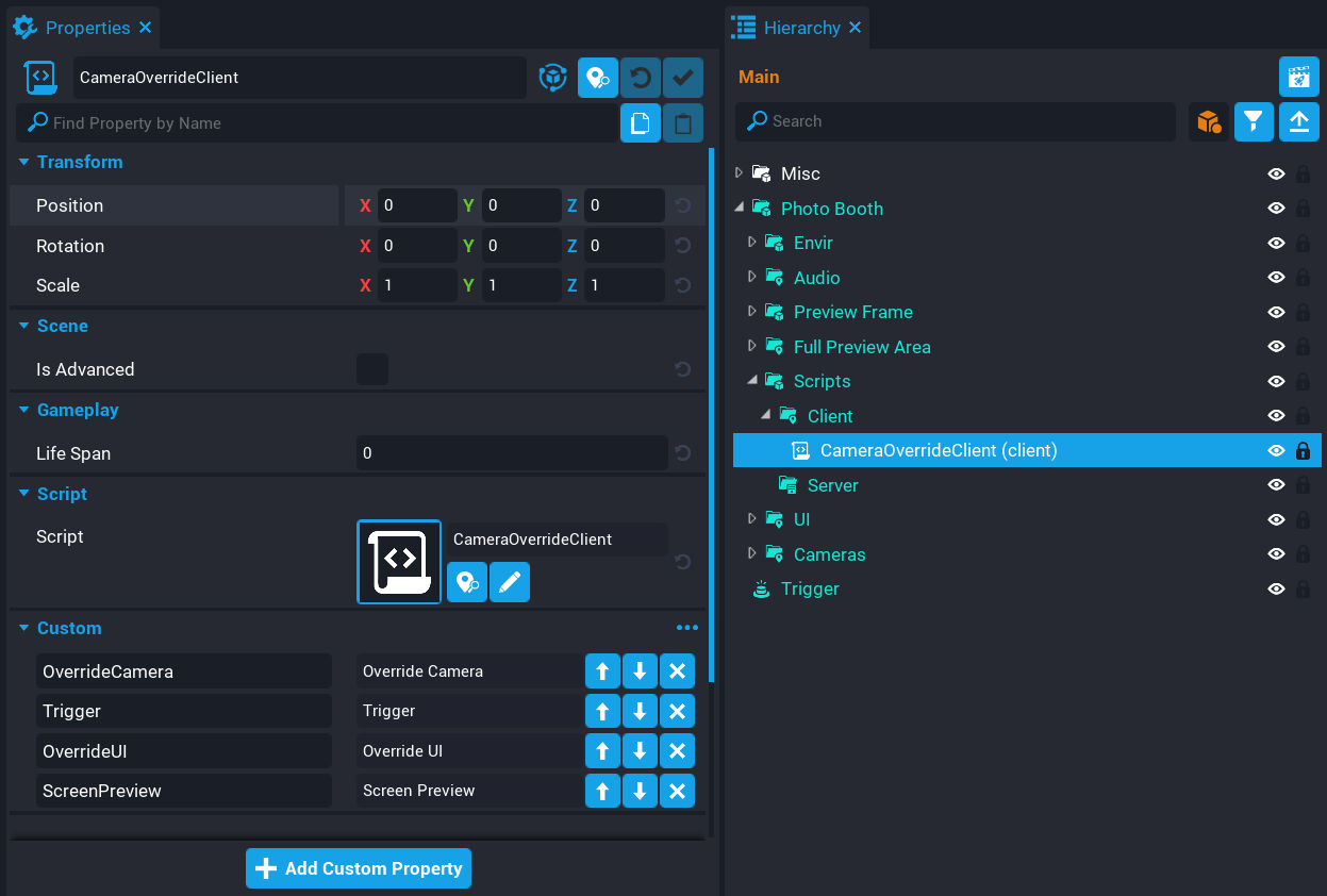 The override camera will switch the current player's camera to a different camera so they can see how they would be positioned in the photo. This will happen when the player enters the area of the photo booth, and when they leave it will switch back to their default camera.