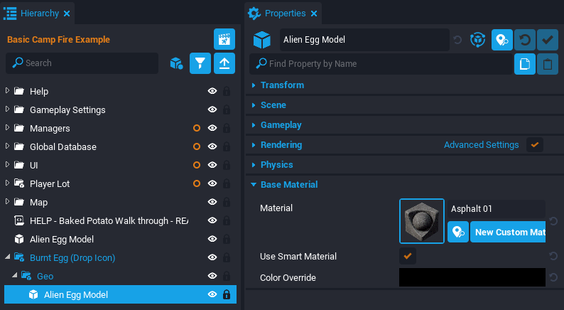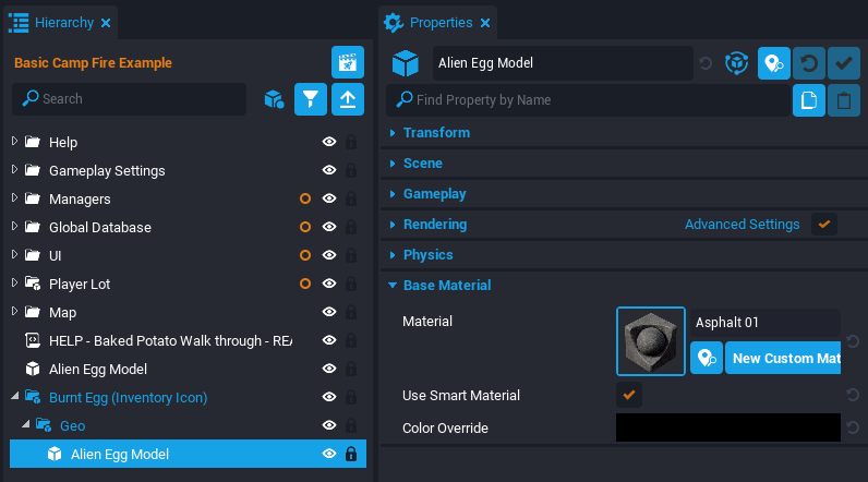 - Select the Alien Egg Model inside the Incubating Egg (Ready) and open the Properties window.
