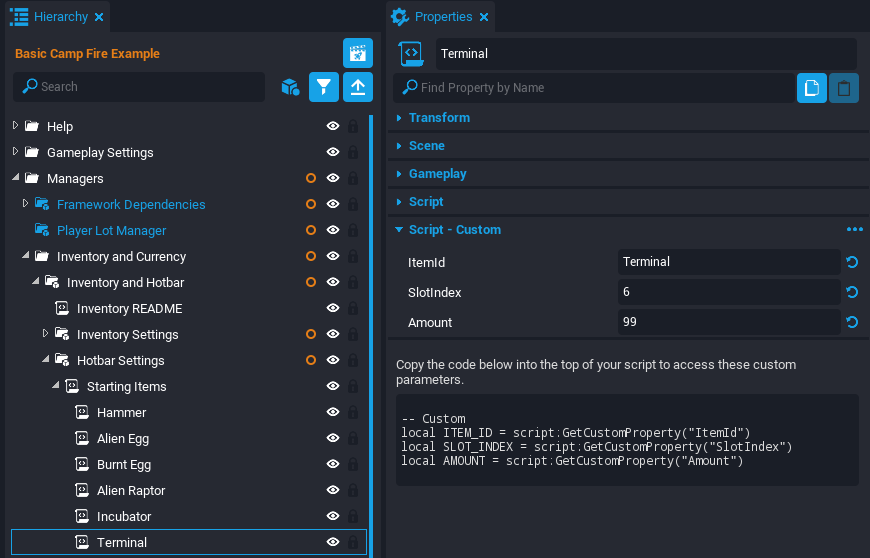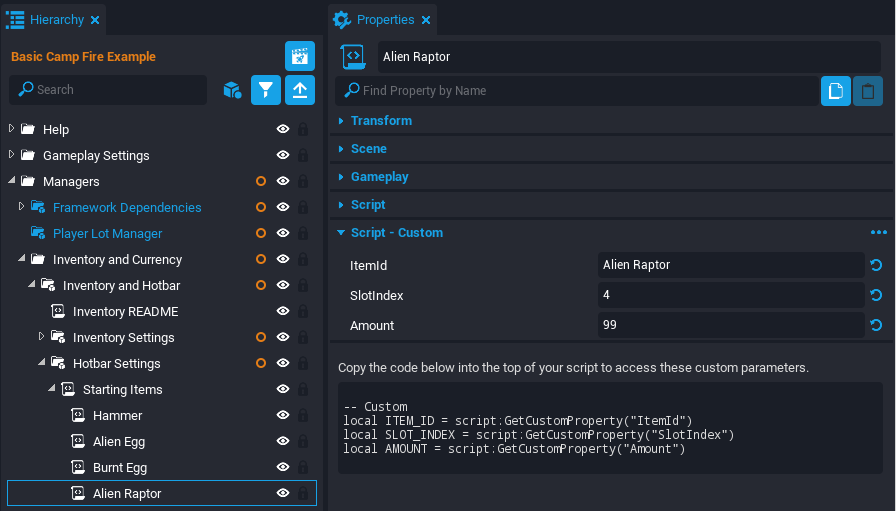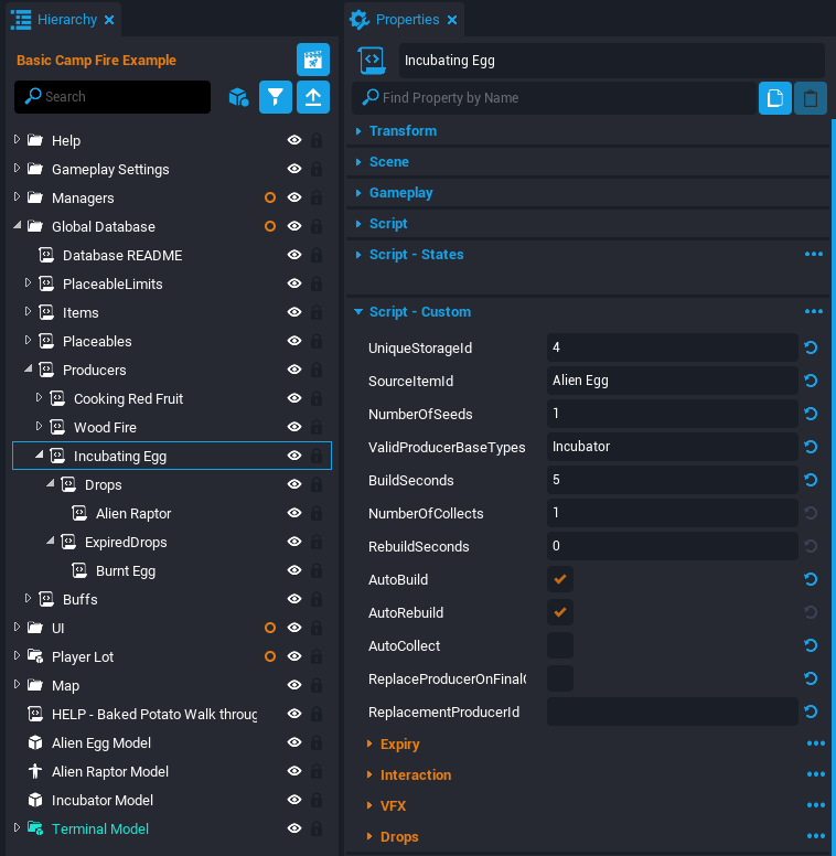 This tutorial will be breaking apart an example scene where the player can light a camp fire and cook fruit on the fire. This tutorial will make a similar Producer that can raise Alien Eggs to become Alien Raptors.