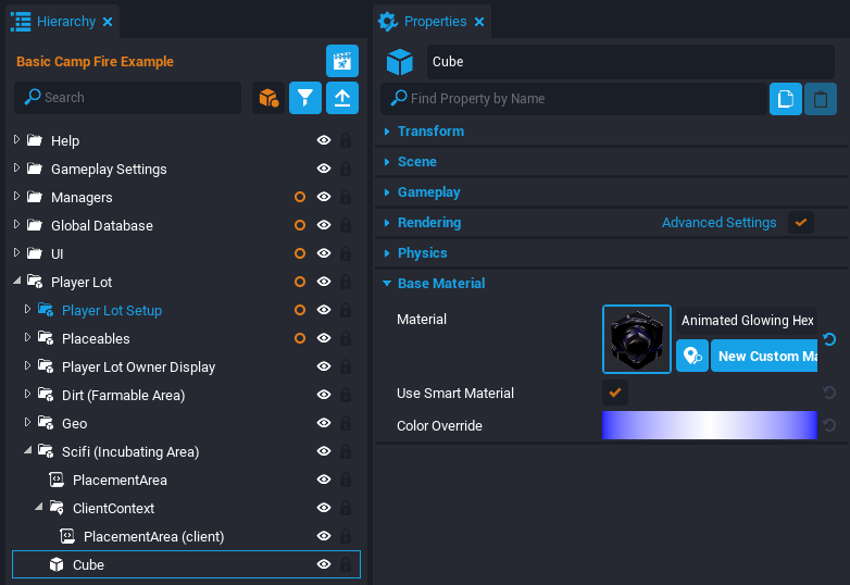 Inside the Scifi (Incubating Area) group, select the Cube object and open the Properties window. Set the Material property to Animated Glowing Hex.