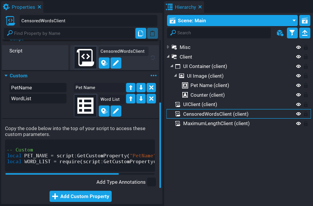 The CensoredWordsClient script will need references to the Pet Name text entry box and the Word List data table. Add the references to the script.
