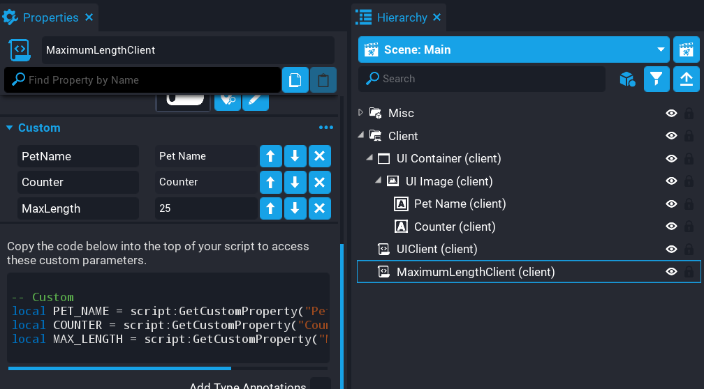Create a new script called MaximumLengthClient and place it into the client context in the Hierarchy. This script will check the length of the text in the text entry box for the pet name, and make sure it doesn't exceed a certain number.