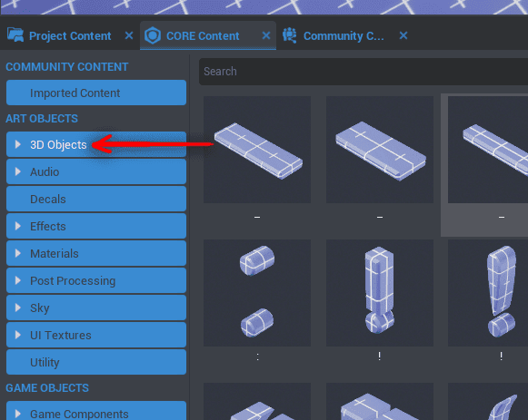 Creators can make games entirely using the finished props provided by Core in the Core Content window and models made by other creators in the Community Content window.