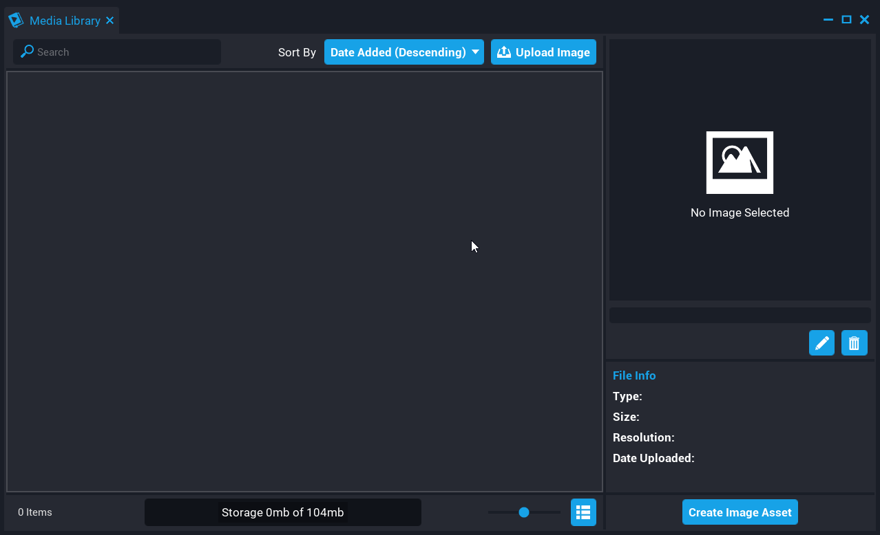 Creators can upload JPEG, JPG, and PNG files to the Media Library by clicking on the Upload Image button. When the Upload Image button is clicked on, a file dialog will appear where creators can browse for the image they want to upload to their library.