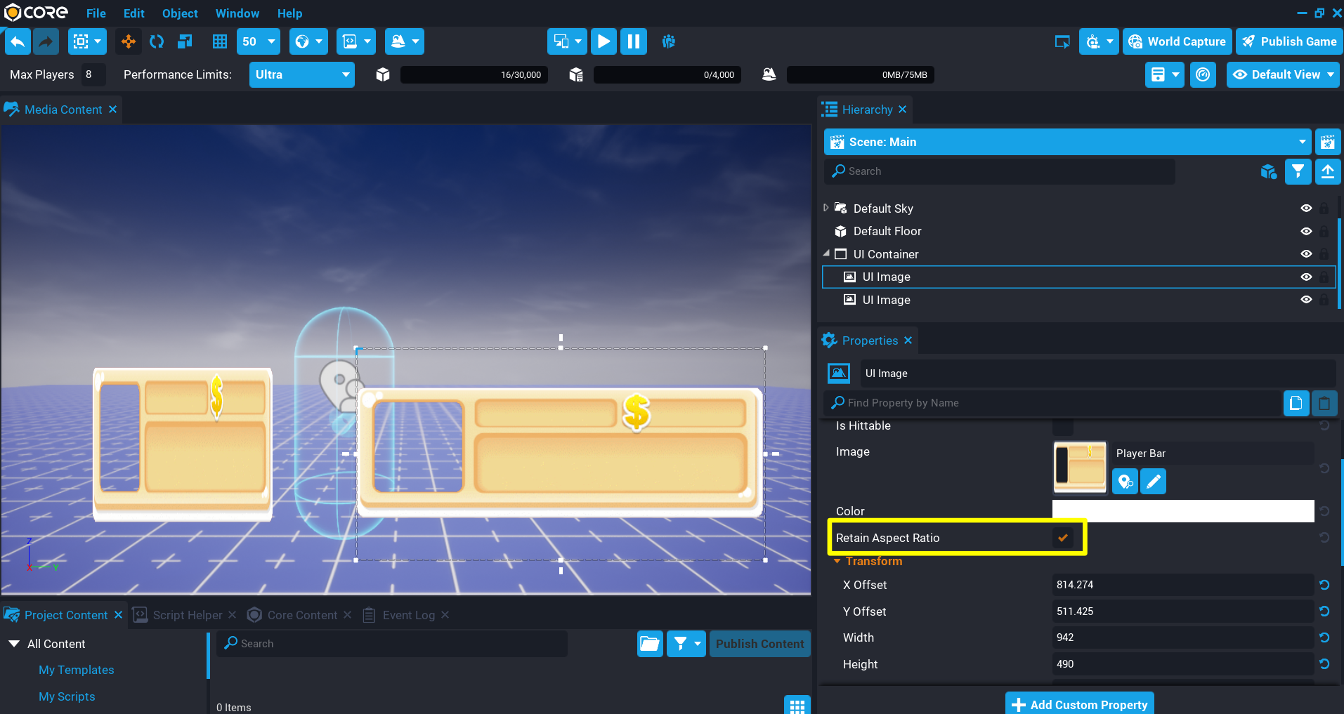 Creators may notice that brushes that get added to the Hierarchy do not maintain the original aspect ratio of the image. By enabling the option Retain Aspect Ratio in the Properties window of the UI Image, the aspect ratio will be retained regardless of its given dimensions.