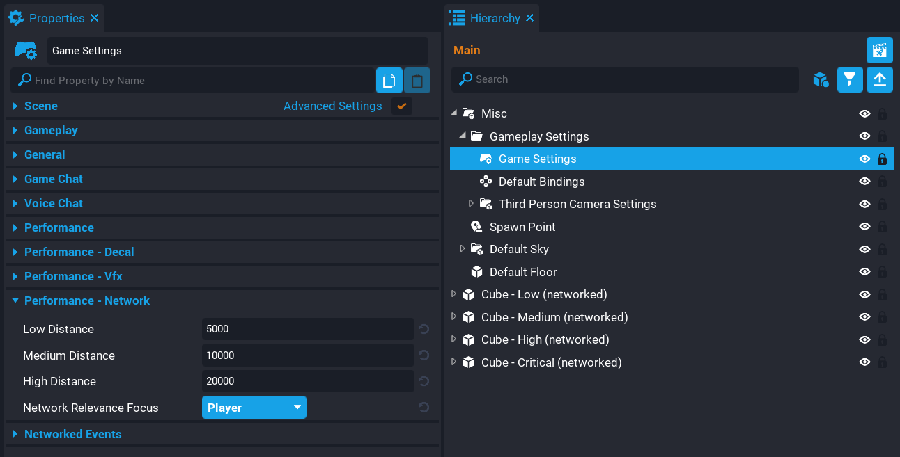 The Game Settings object found in the Hierarchy contains a Performance - Network Relevancy category in the Properties window where creators can change network relevancy distance and settings.