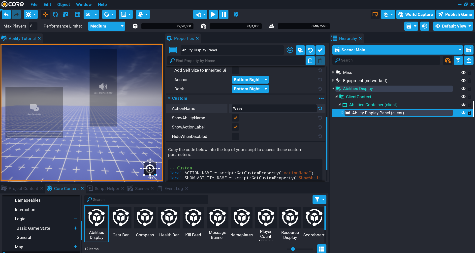In this tutorial you will create an ability that can be picked up in the world, and when activated, the player will wave. You will be using Core Content components that can be placed in the Hierarchy, so no Lua knowledge is needed.