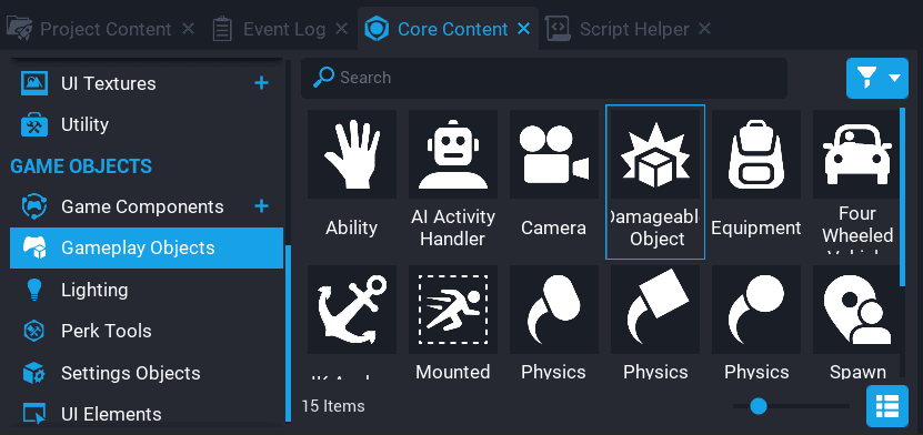 Add a Damageable Object to the Hierarchy. You can find this in Core Content under Gameplay Objects. Name the Damageable Object Boss Damageable Object.