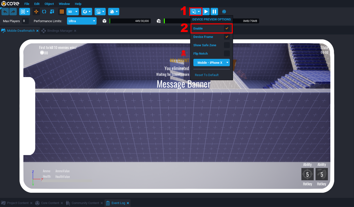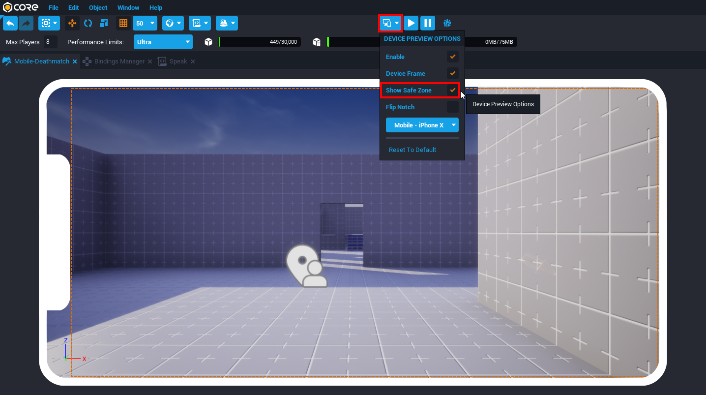The Core Editor has some useful tools to assist creators in making their games mobile-friendly. Using a Binding Set will help connect an action to multiple types of device inputs. The Device Preview Options can help preview gameplay and UI on a variety of devices. There are also performance restrictions on smaller devices that may require some objects only being rendered based on the device quality.