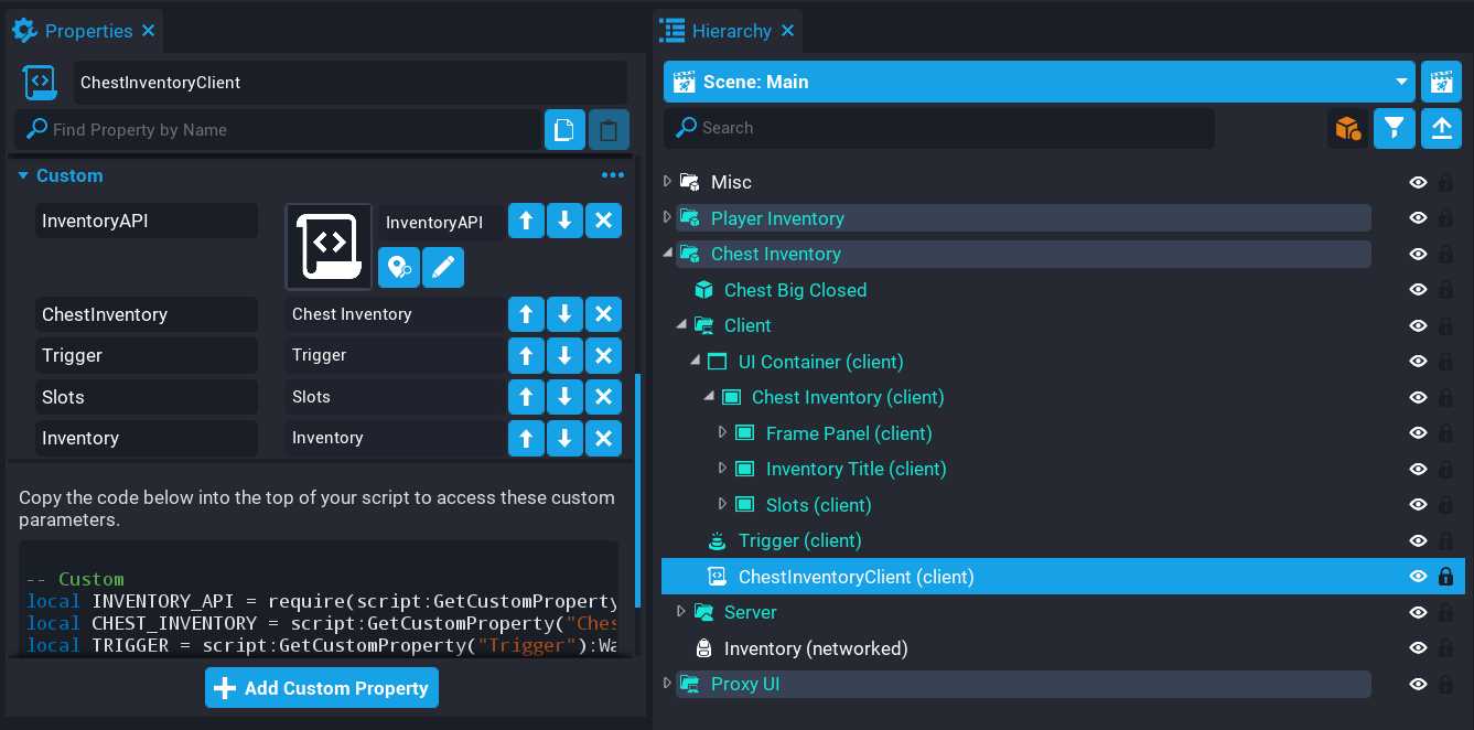 Open up the ChestInventoryClient script and add require the inventory API, and create the references for the properties.