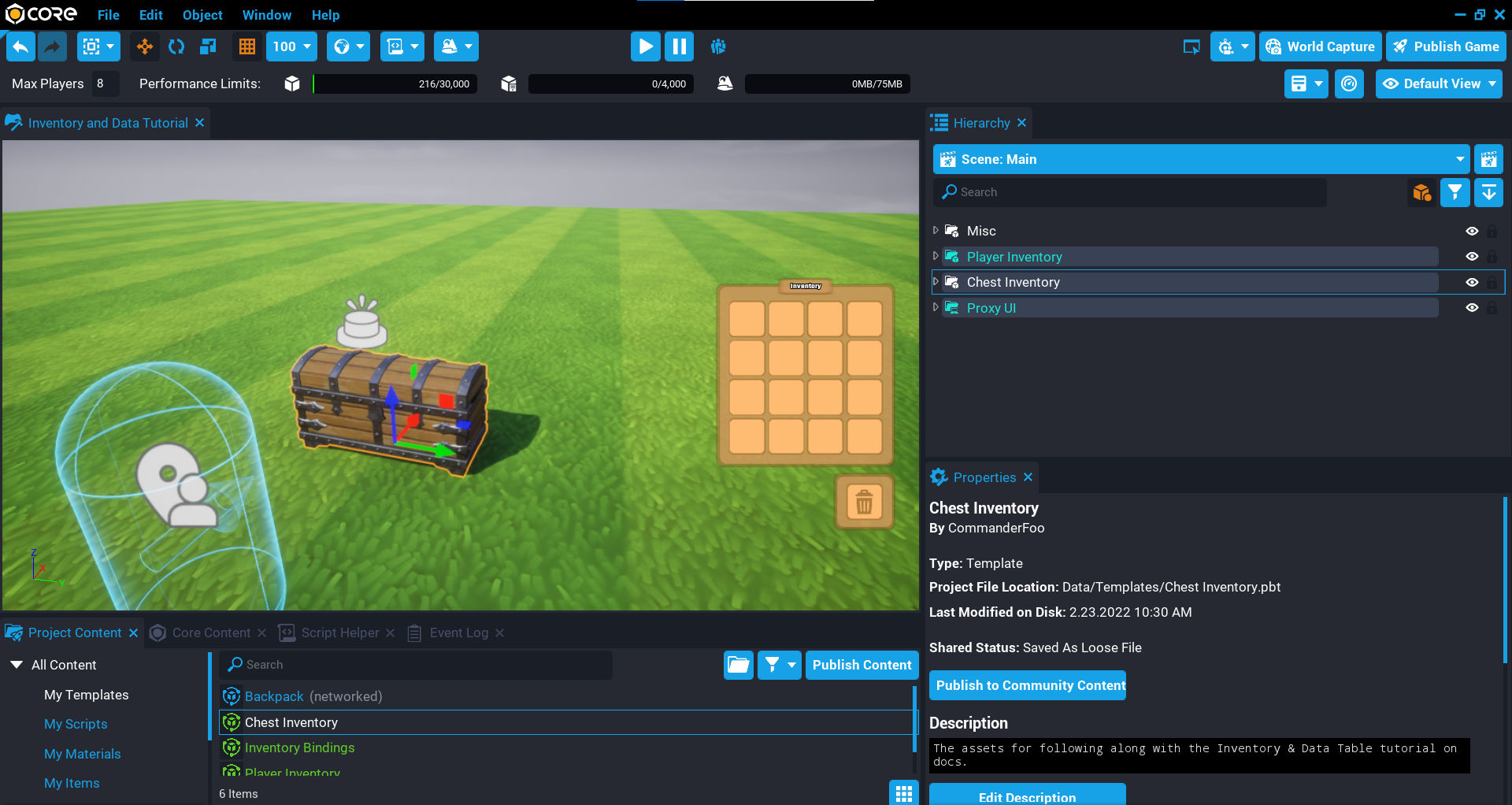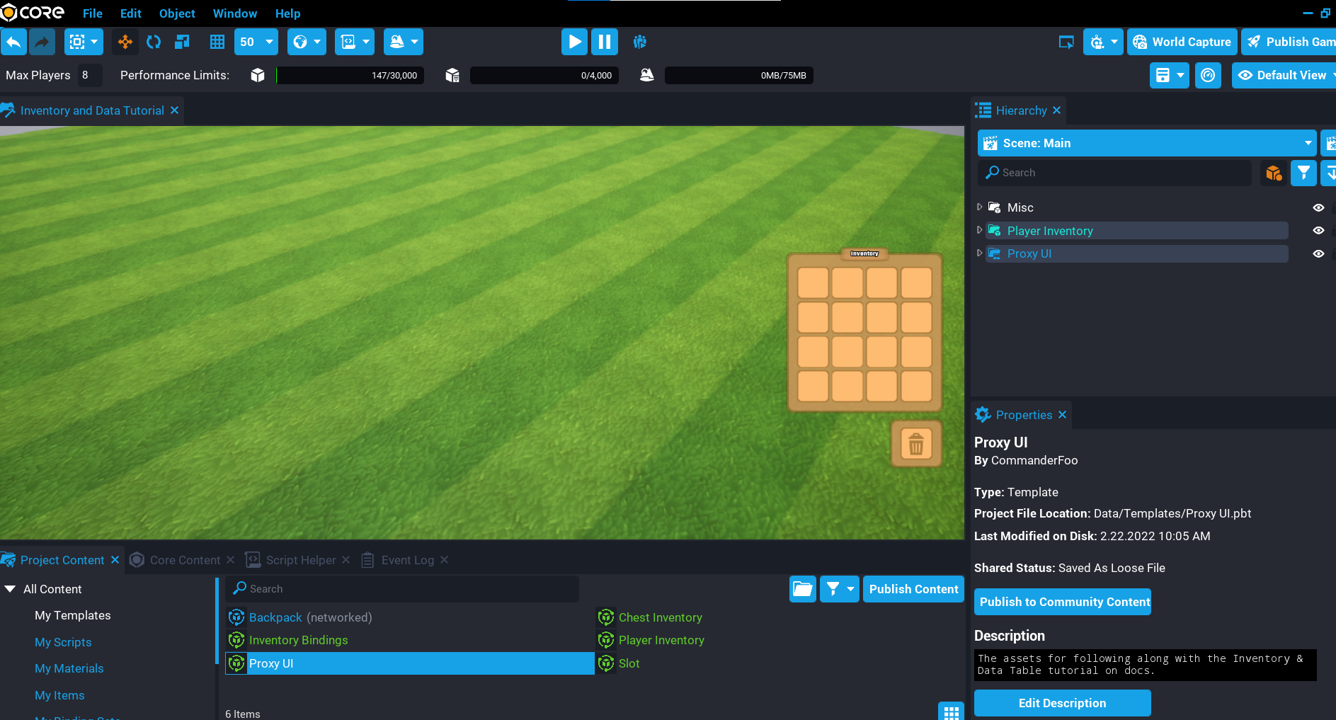 You will be importing an asset from Community Content that will contain assets to help build up the project. These assets have been designed for ease of use so you can focus on the inventory API and objects.
