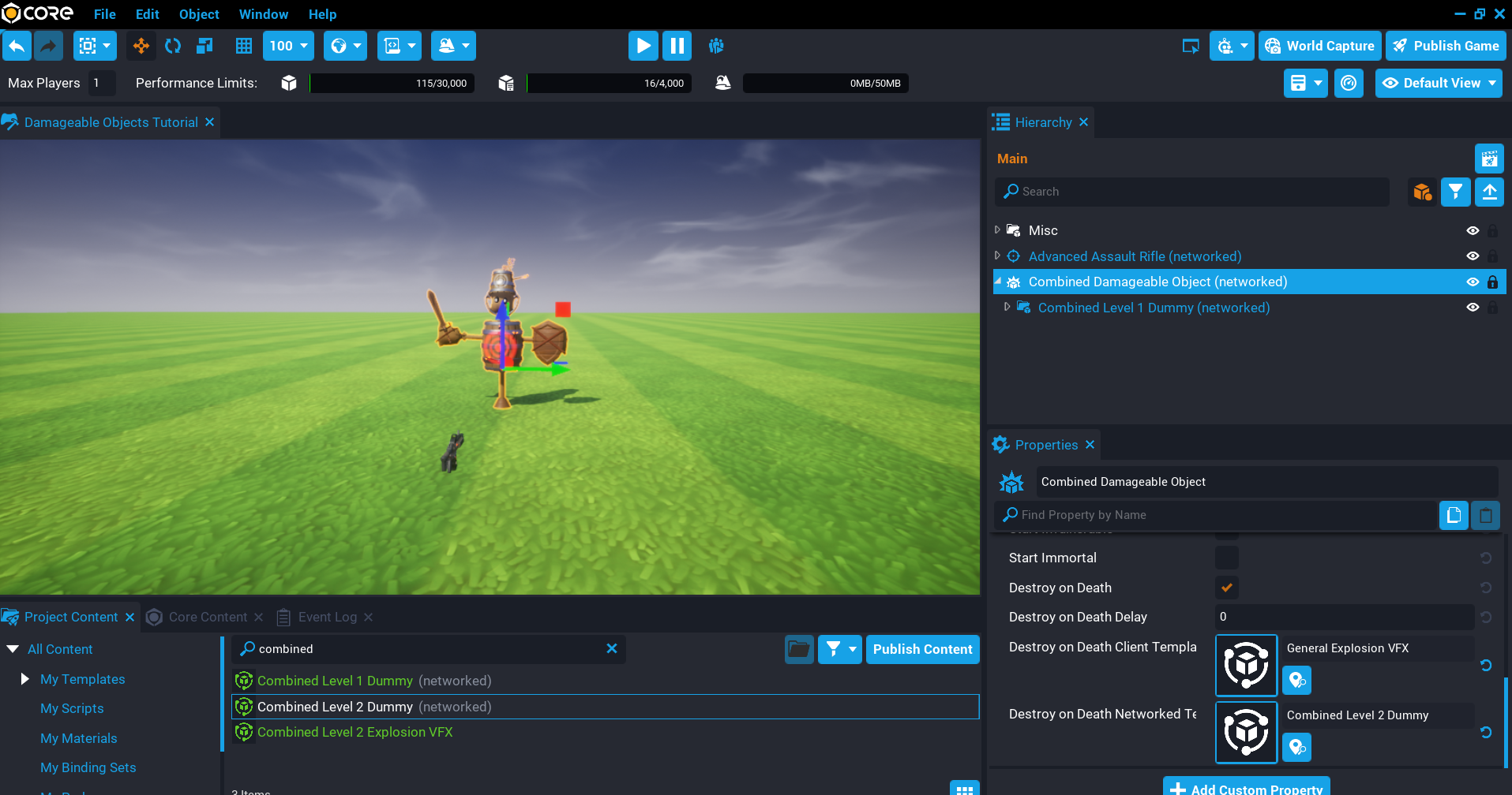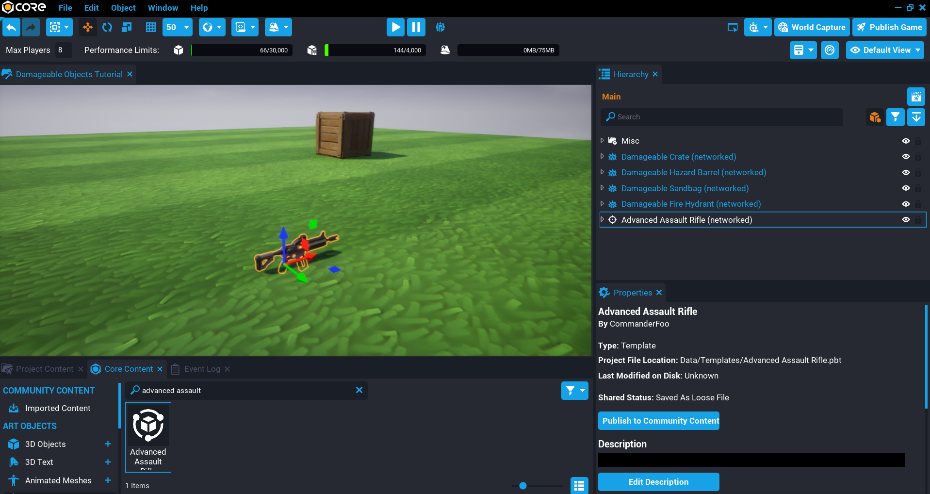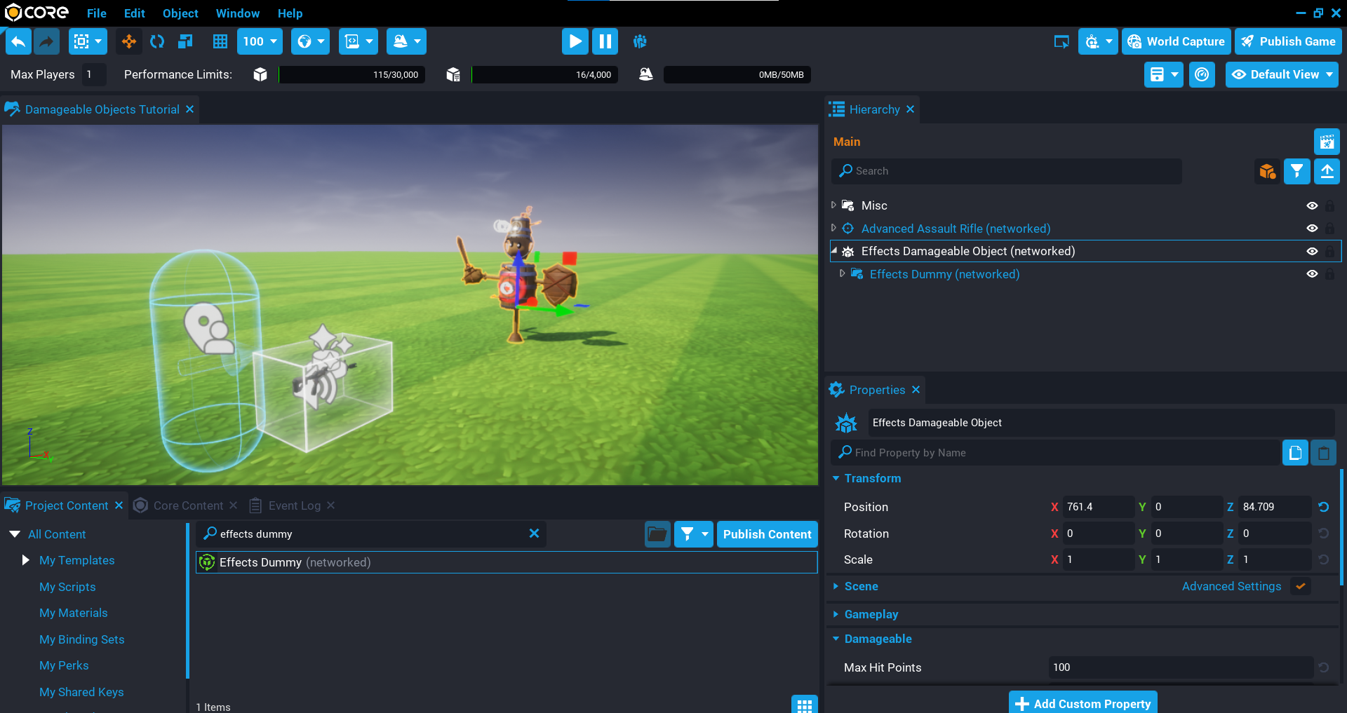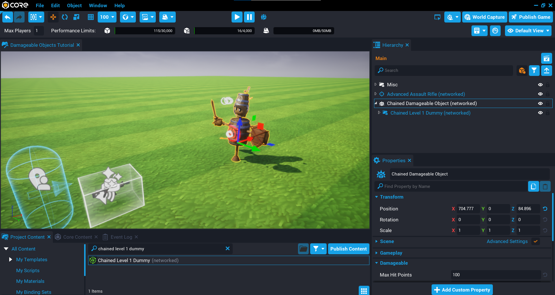 Before you dive into learning how to create your own damageable objects, let us take a look at the default damageable objects that Core provides for you in Core Content. This will give you an idea of what damageable objects can do.