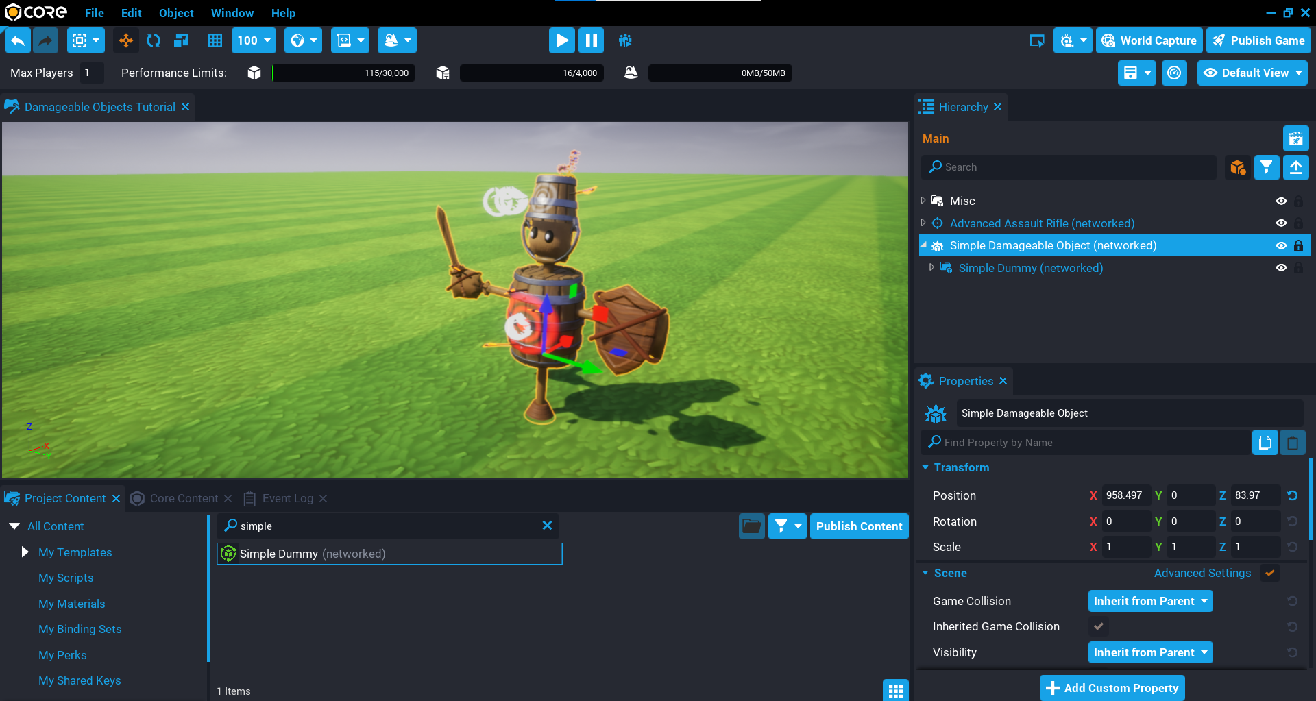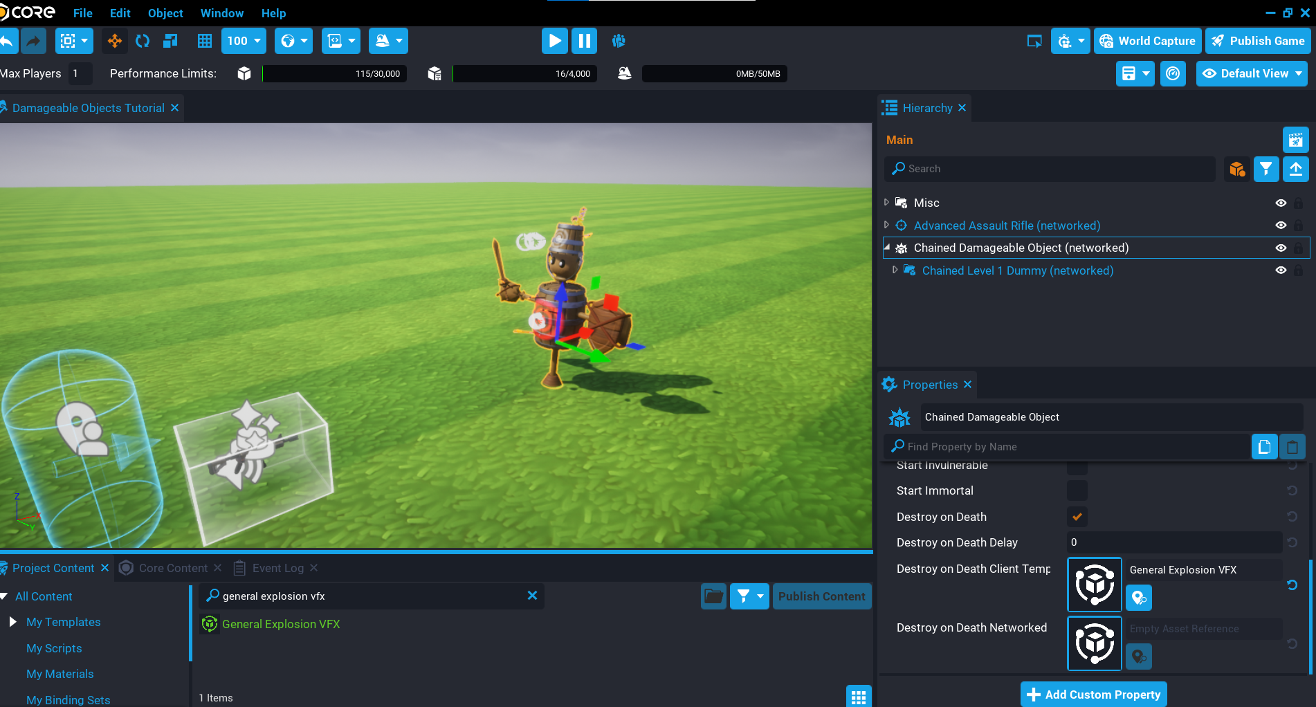 In the previous section, you may have spotted the Damageable Object when searching for damageable in the Core Content window. This object on its own is not too useful, it will have no visual geometry, and can not be destroyed. For a damageable object to take damage and be destroyed, it requires geometry inside the damageable object that has collision. When these objects get hit (for example, by bullets, or other forms of damage), the damage is applied to the closest damageable object parent.
