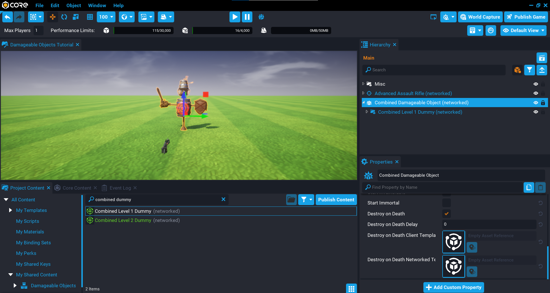 In this section you will be creating a more advanced dummy that will require the player to destroy individual parts of the dummy first before it can be killed. You will be setting up nested damageable objects for the individual parts, and also writing some Lua code to communicate between the server and the client to show the amount of damage the player is doing to each part.