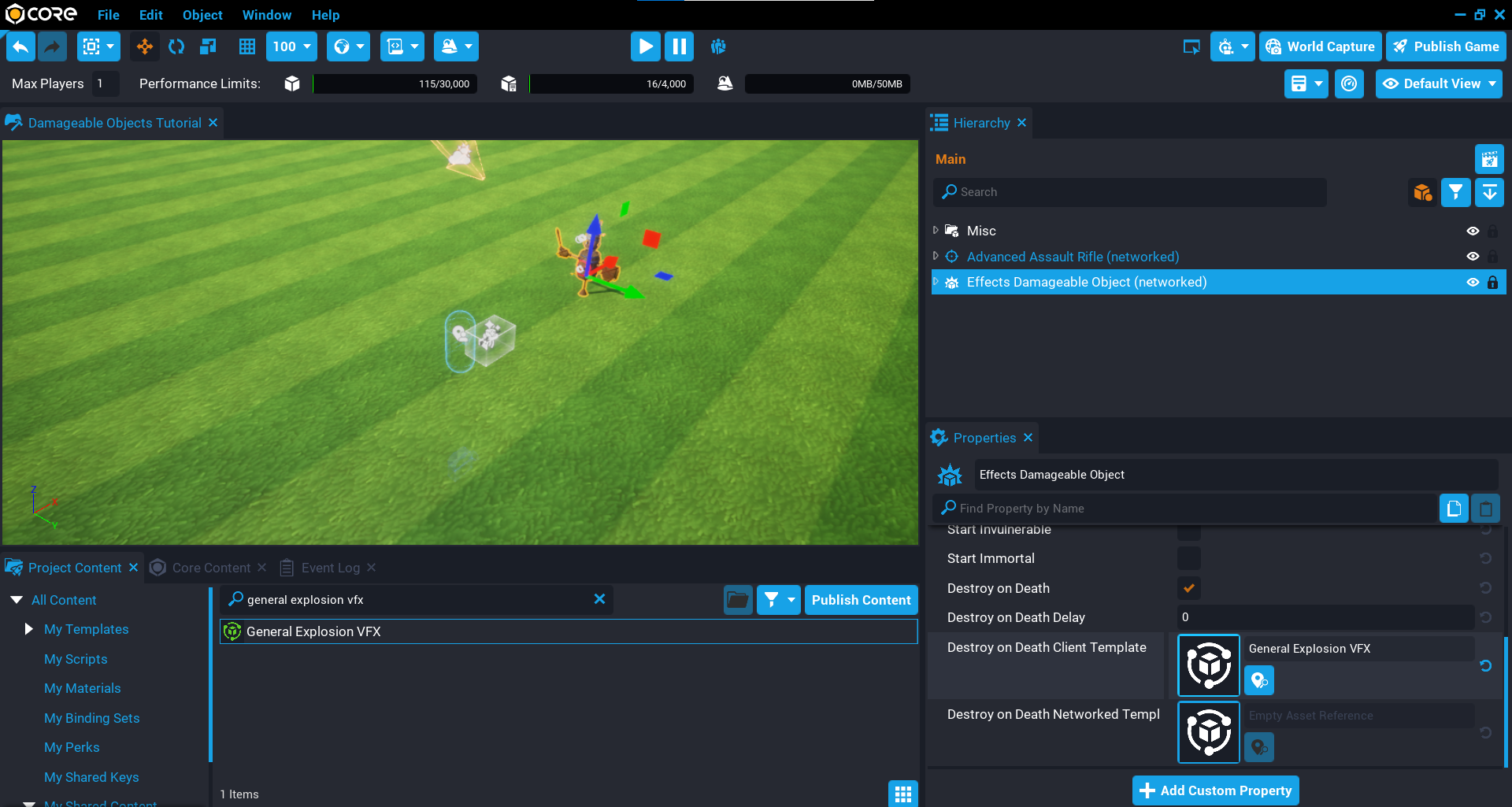 Test the game by picking up the Advanced Assault Rifle and shooting the damageable objects. You will see they will be destroyed, and when they are destroyed, audio, and effects are played.