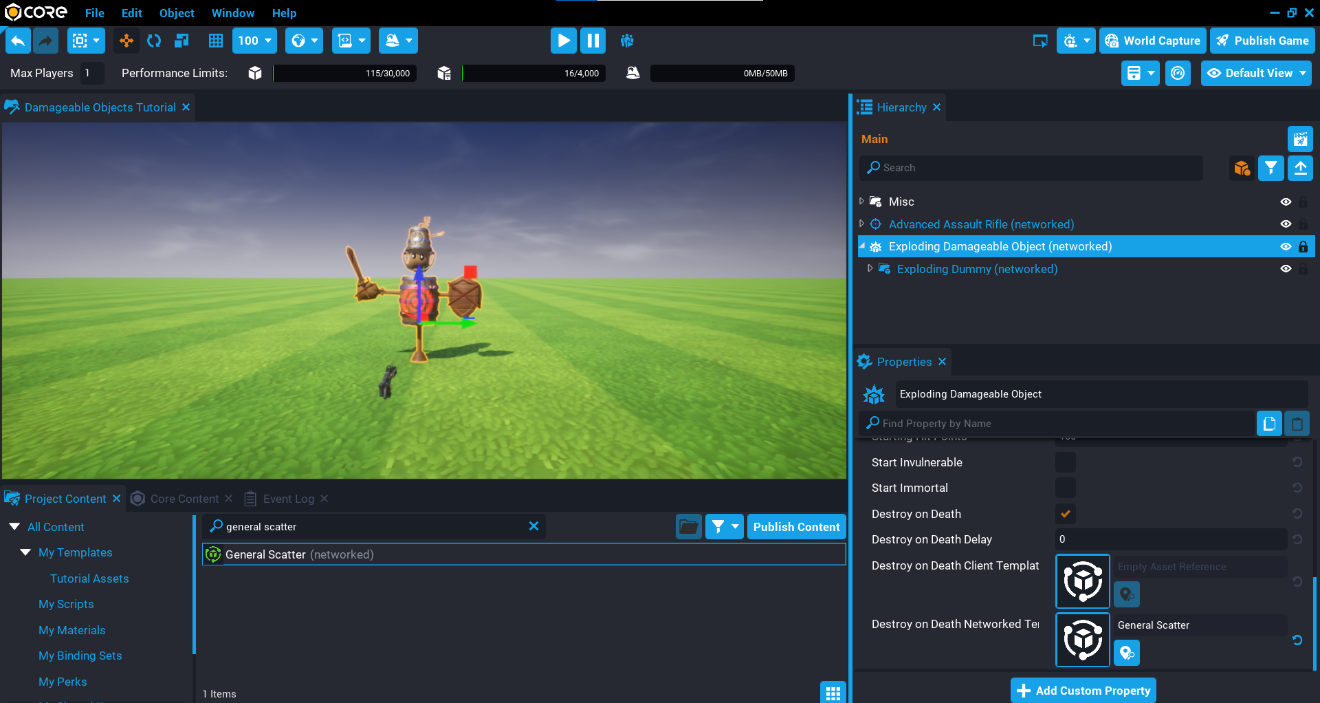 The Destroy on Death Networked Template property will be set to template that is also a damageable object. This shows you how easy it is to create damageable objects that can be added to existing damageable objects to get far more interesting effects. This is all possible without any Lua scripting, because the ScatterClient script is an optional component to improve the effects when the dummy has been killed.