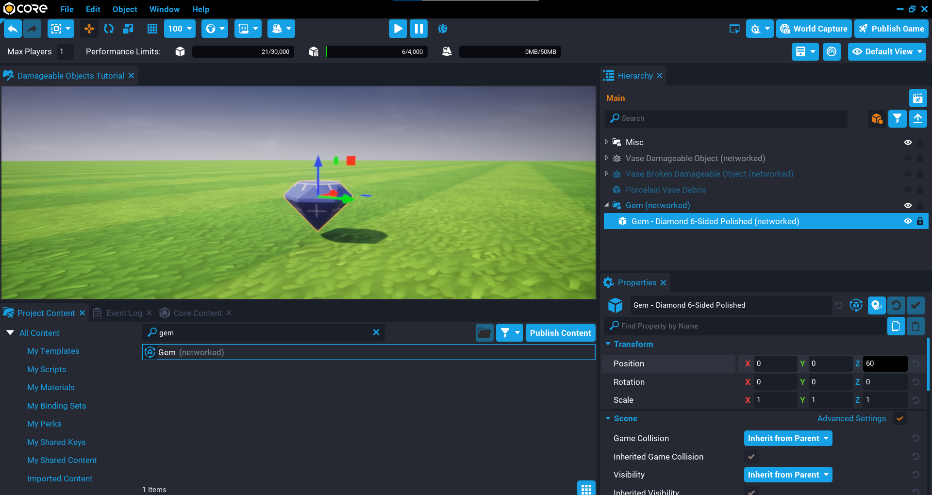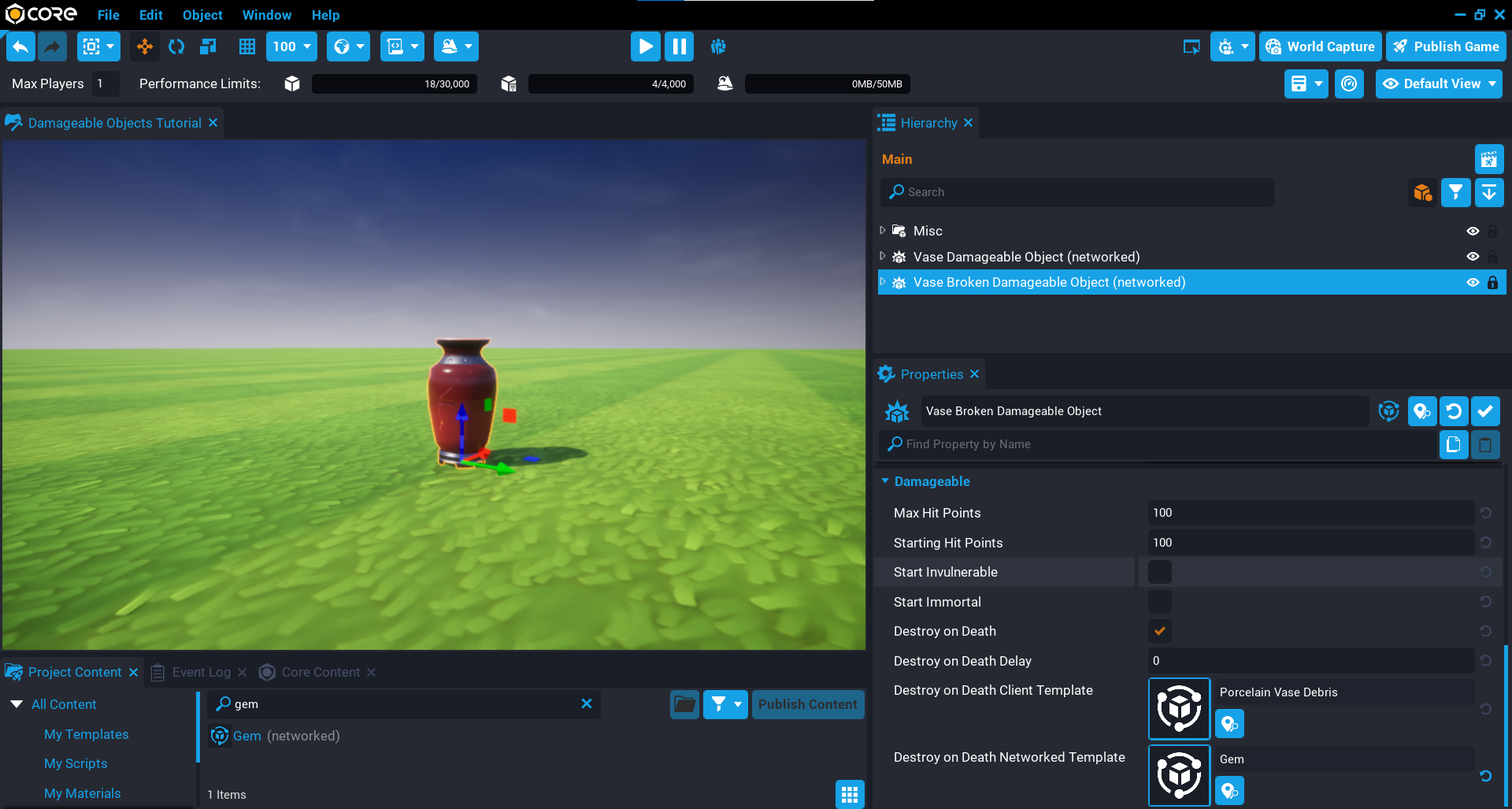 When the Vase Broken Damageable Object is destroyed, it will also spawn a gem object. This could be a pickup that players in your game can collect.