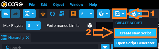 1. To get started making this light switch work, you are going to create a new script by clicking the Create Script Button Create Script button in the toolbar at the top of the editor.