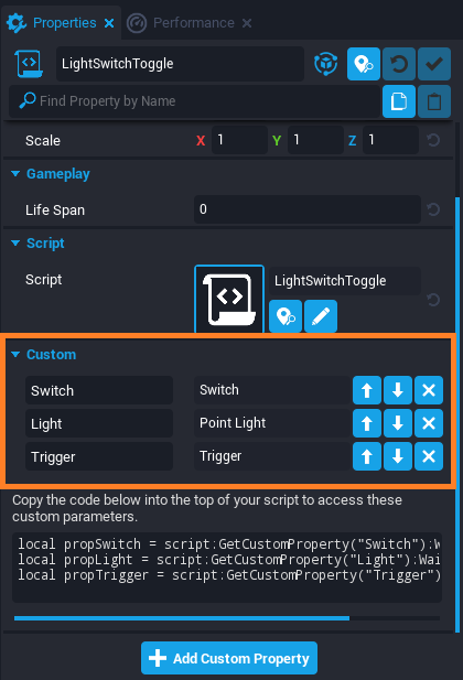 The Custom Properties section of the script should now look like this: Custom Properties