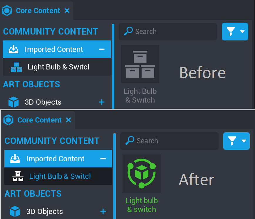 1. In the Core Content window, find the Imported Content section then find Light Bulb & Switch Package.
