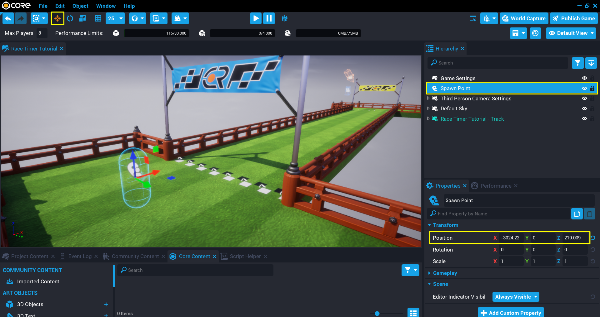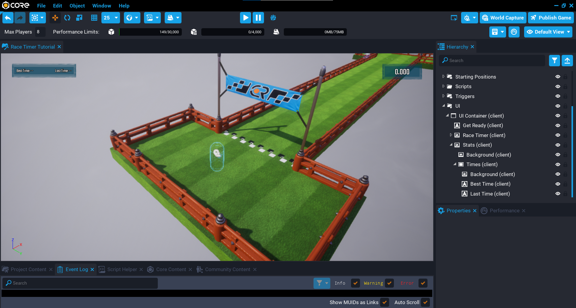 A track has been uploaded to Community Content to help you get started. This can be imported from the Community Content window by searching for Race Timer Tutorial - Track by CoreAcademy.