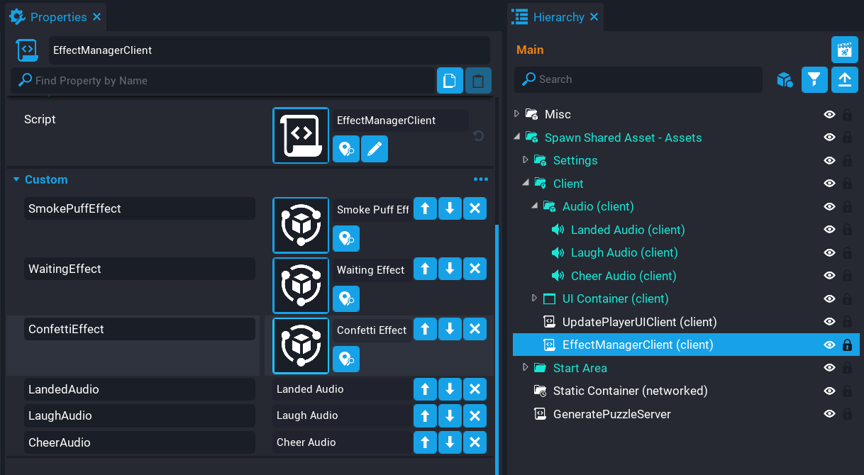 The EffectManagerClient script needs to know which effects to spawn, and which audio to play. So you will need to create some custom properties.