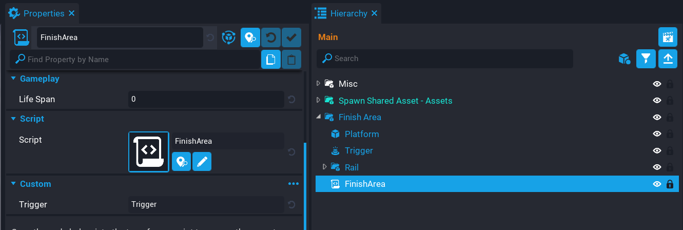 Create a new script called FinishArea. This script will need to be placed inside the Finish Area template so it can detect when a player has entered the trigger to play some effects and restart the game.