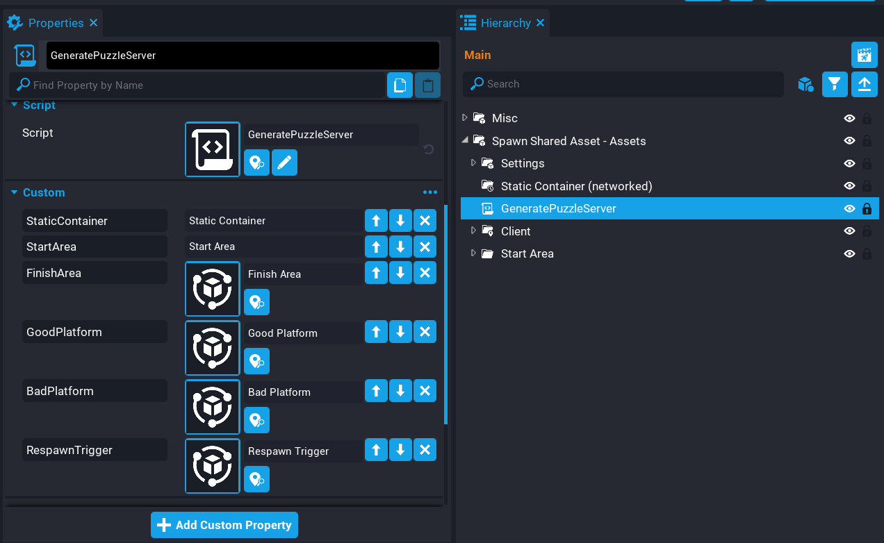 Open up the GeneratePuzzleServer script and add the references to the custom properties you added.