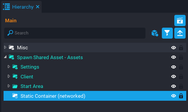 When spawning shared assets, they need to go into a networked Static Context. A static context is a good choice when creating procedural content, as it will reduce the number of networked objects in your game. Objects spawned inside a static context can not be moved or modified, however, as a unit, they can be moved.