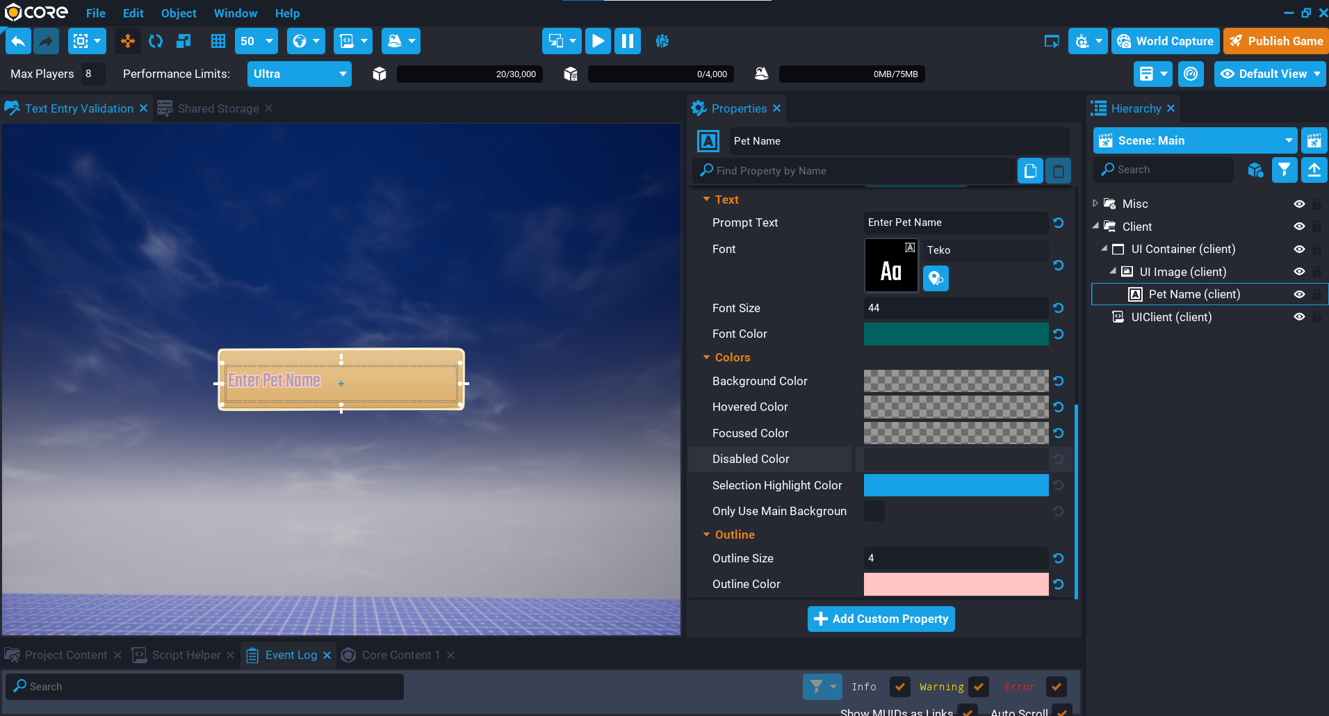 In this section, you will create a system that allows you to specify a maximum number of characters that are allowed to be used. This can be useful, for example limiting the length of a Pet name that the player can enter into the text entry box.