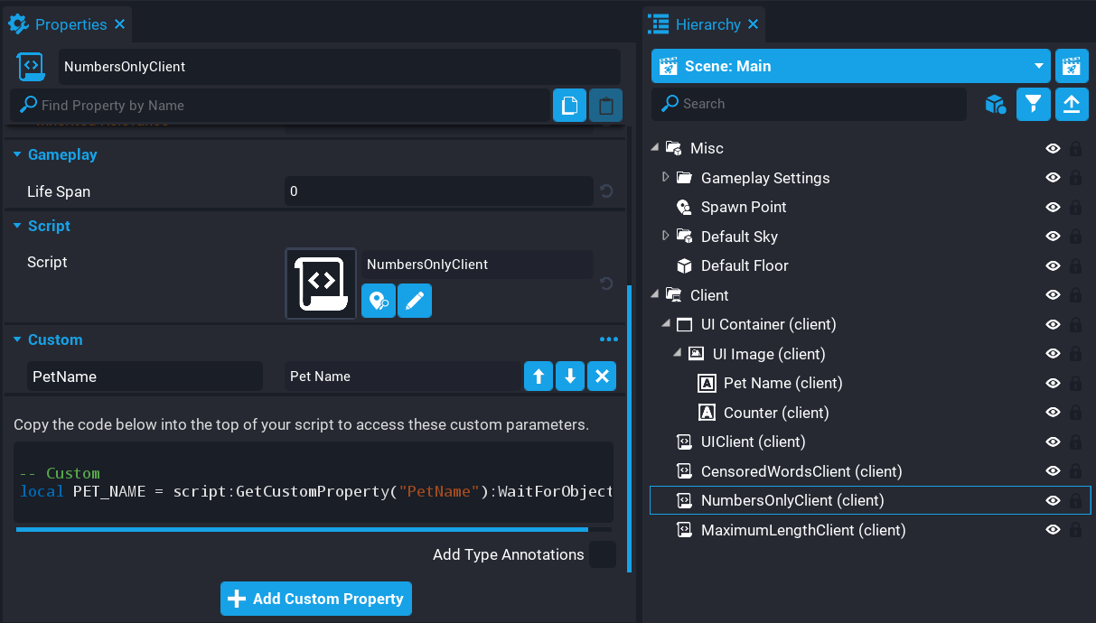 local PET_NAME = script:GetCustomProperty("PetName"):WaitForObject()